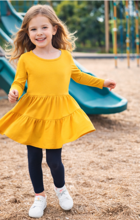 I want clothes that look sweet in photos but also survive the slide, the playground mulch, and the mystery stain that shows up before we even leave the house. That is why this little mustard dress with navy leggings caught my attention. It is cute, but it still feels like real kid clothing, not a costume.