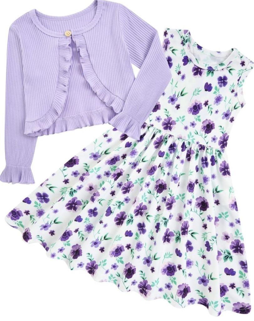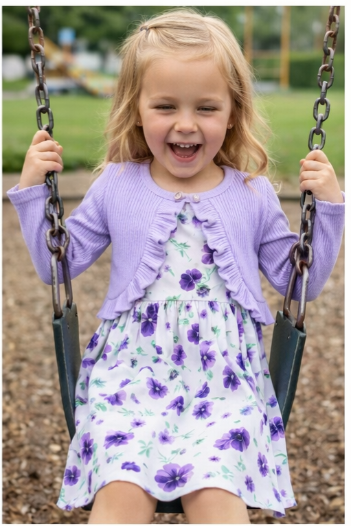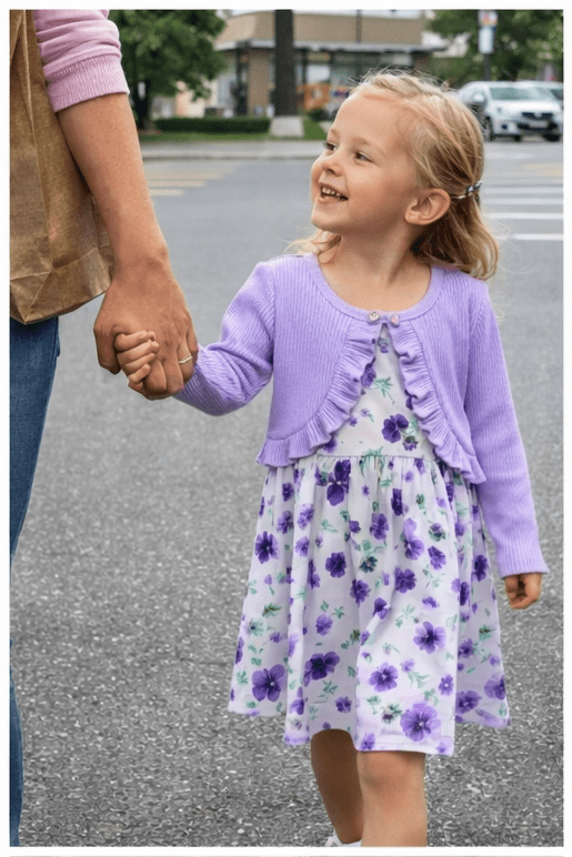 Some outfits just feel easy the moment you see them. This little floral dress with the soft lavender cardigan is one of those pieces that looks sweet without trying too hard. It is the kind of set that works for ordinary days, school mornings, and the quick errand runs that make up real mom life.